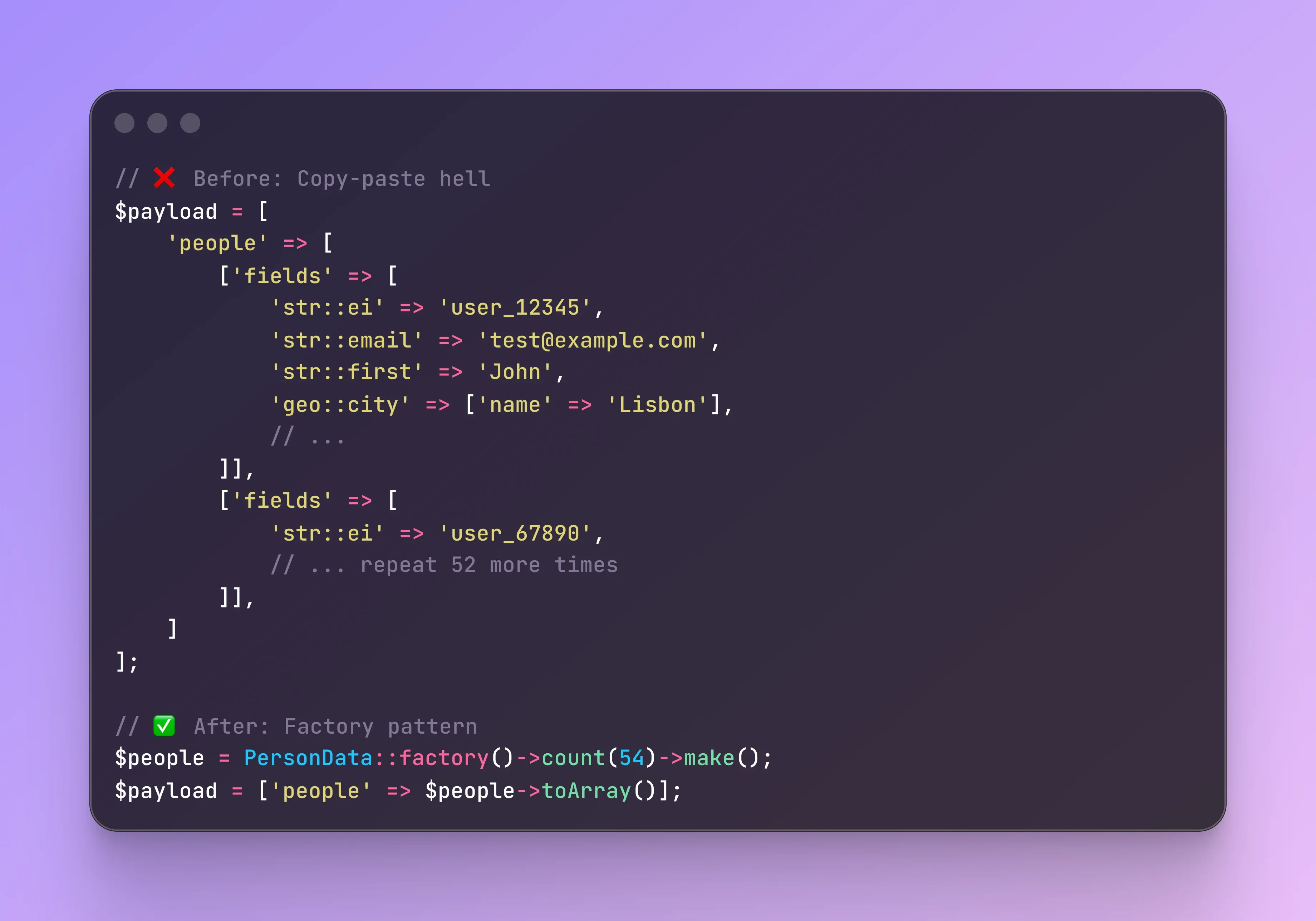 One source of truth. When the API changes (Ortto adds a required phone field, for example), you update the factory definition. Every test that uses PersonData::factory() instantly gets the new structure.
